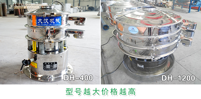 不銹鋼振動(dòng)篩型號(hào)有:DH-400、DH-600、DH-800、DH-1000、DH-1200、DH-1500、DH-1800、DH-2000等八種型號(hào),不同的型號(hào)選用的振動(dòng)電機(jī)也不同,型號(hào)越大電機(jī)功率就越高價(jià)格也就越高,每個(gè)型號(hào)之間相差600-3000元不等。