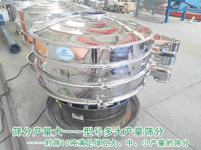 不銹鋼振動篩型號規(guī)格有八種(可根據(jù)特殊需求定制型號)滿足了客戶對于不同產(chǎn)量的要求,可根據(jù)產(chǎn)量高低選擇不同大小型號的設(shè)備,可滿足時篩綠豆10噸左右!