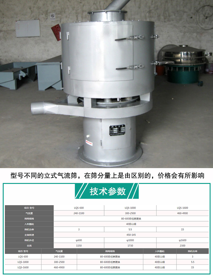 型號不同的立式氣流篩,在篩分量上是由區(qū)別的,價(jià)格會(huì)有所影響。大漢立式氣流篩型號有LQS-600型、LQS-1000型、LQS-1600型等,不同型號的立式氣流篩,其氣流量、電機(jī)功率、篩機(jī)外徑等都是不同的,所以價(jià)格自然也是不同的。