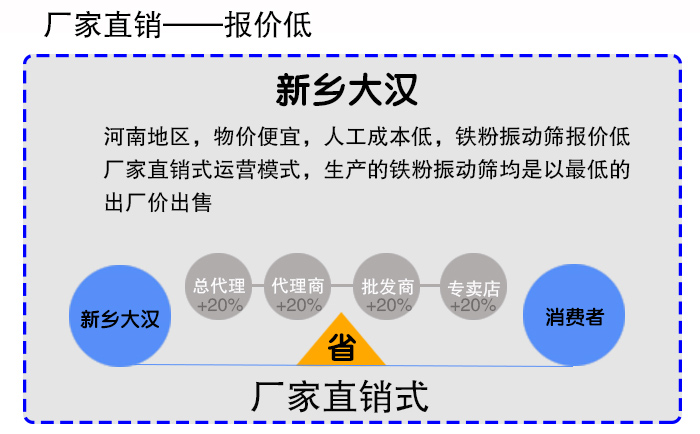 新鄉(xiāng)大漢位于河南新鄉(xiāng),廠家眾多,競爭激烈,廠家之間不得不壓低價格形成價格優(yōu)勢,再加上新鄉(xiāng)地區(qū)物價低,人工成本低,所以鐵粉振動篩報價低,另外,大漢廠家采用廠家直銷式運營模式,生產(chǎn)的所有產(chǎn)品均是以低的出廠價出售,所以關(guān)于鐵粉振動篩價格方面的問題,用戶完全不必擔(dān)心,因為大漢廠家給出的報價是為合理的。